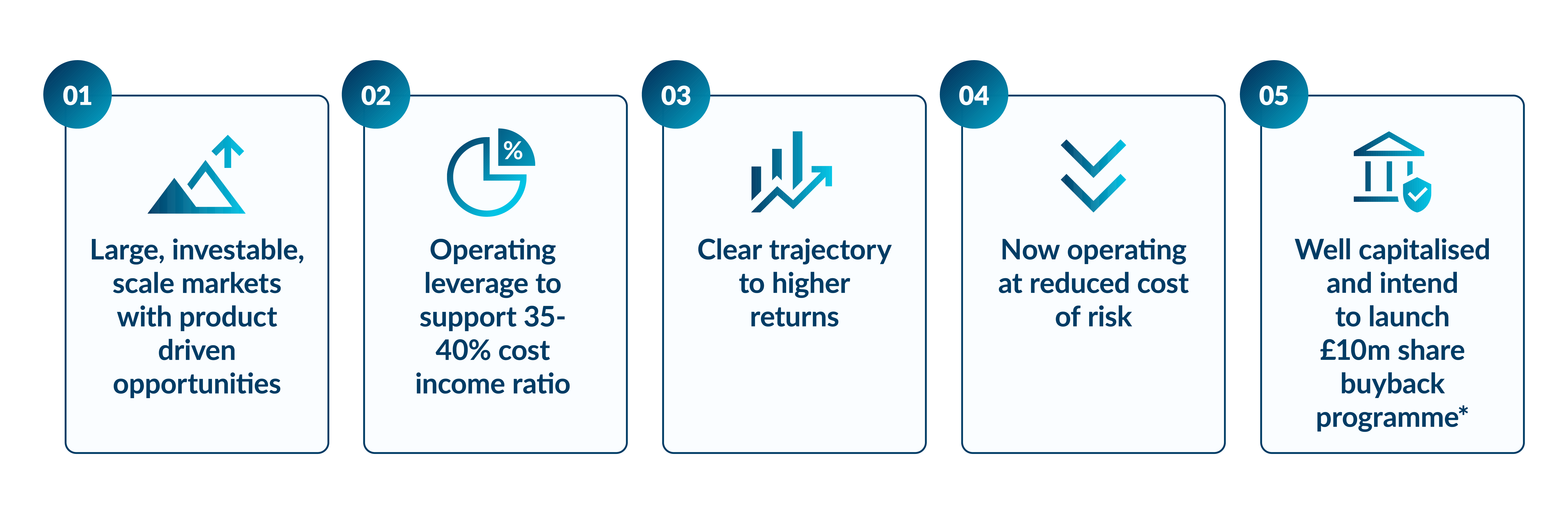 We have two lending divisions in Retail and Business Finance. Our medium-term targets are to deliver c.10% growth in these large addressable markets, and will only do so at high returns, to deliver over 16% return on average equity in the medium term. This is supported by stable funding through our retail deposits franchise.